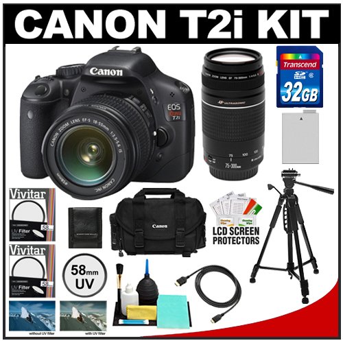 Blackfriday Canon EOS Rebel T2i Digital SLR Camera & 18-55mm IS Lens + EF 75-300mm III Zoom Lens + 32GB Card + Battery + Canon 2400 DSLR Gadget Bag Case + Tripod + HDMI Cable + Filters KitKit includes: The Canon EOS Rebel T2i features a 18.0 Megapixel CMOS Image Sensor and increased light sensitivity for low light photography, the EOS Rebel T2i also has an advanced HD Movie mode for Full HD movies. Able to capture up to 3.7 frames per second. Advanced Live View, a new wide-area screen, plus features like Canon's brilliant Auto Lighting Optimizer and Highlight Tone features ensure brilliant photos and movies, easily. The Canon EF-S 18-55mm f/3.5-5.6 IS zoom lens is designed with Canon's Optical Image Stabilizer technology while retaining the compactness and lightness of previous models. Its stabilization allows sharp hand-held shots at shutter speeds up to four stops slower than otherwise possible. The Canon EF 75-300mm f/4-5.6 III Zoom Lens is a compact and lightweight 4x telephoto zoom lens ideal for shooting sports, portraits, and wildlife. The improved zoom mechanism also makes zooming smoother than ever. The front part of the zoom ring now sports a silver ring for a luxury touch. | |