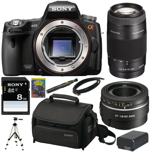 ▷▷▷Blackfriday Sony Alpha A55 DSLR A55 SLT-A55V 16.2MP DSLR with Translucent Mirror Technology and 3D Sweep Panorama + Sony 75-300 Zoom Lens and SAL50F18 50mm Lens + Accessory Kit
