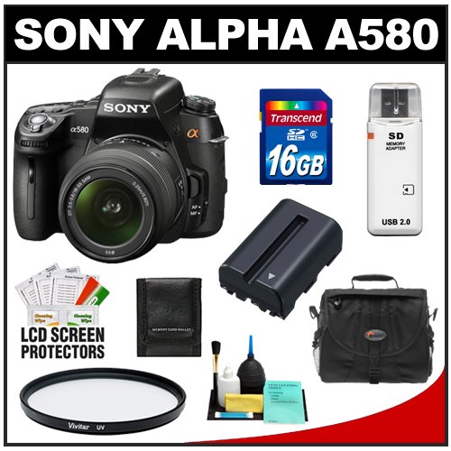 Blackfriday Sony Alpha DSLR-A580 16.2 MP Digital SLR Camera & 18-55mm Lens with 16GB Card + Battery + Case + UV Filter + Cleaning & Accessory KitKit includes: Equipped with Quick AF Live View, the Sony Alpha α580 DSLR captures the fast action shots that other cameras miss. Take in the landscape with 3D Sweep Panorama and see into the dark with Handheld Twilight and Multi-Frame NR modes. Preserve your memories with amazing Full HD 1080i movies. Take more high-resolution pictures faster with this 16GB Class 6 High-Capacity SecureDigital (SDHC) memory card. Increase your shooting capacity with this powerful NP-FM500H battery. The Vivitar 55mm UV glass filter will filter out unwanted UV light and prevent inaccurate color and less sharp image quality. This multi-compartment case will easily hold your camera, lenses, flash, and accessories. Transfer files quickly and easily with this convenient USB 2.0 SecureDigital (SD) Card Reader. Keep multiple memory cards protected and organized with this durable storage wallet. This 6-piece cleaning kit contains a Hurricane Air Blower, Lens Cleaning Tissues, Lens Cloth, Lens Cleaning Liquid, Brush and Cotton Swabs. Reduce glare, enhance your view, and prevent scratching with this set of LCD screen protectors.