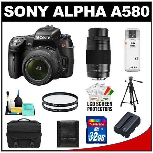 Blackfriday Sony Alpha DSLR-A580 16.2 MP Digital SLR Camera with 18-55mm Lens & 75-300mm Lens + 32GB Card + Battery + Case + UV Filters + Tripod + Accessory KitKit includes: Equipped with Quick AF Live View, the Sony Alpha α580 DSLR takes in the landscape with 3D Sweep Panorama and also has Handheld Twilight and Multi-Frame NR modes. It records Full HD 1080i movies. This lightweight standard 18-55mm f/3.5-5.6 zoom lens features smooth and silent Auto Focus operation. It offers a versatile, all-purpose range for beautiful shots on your Sony DSLR camera. The Sony Alpha 75-300mm f/4.5-5.6 Telephoto Lens is a compact, lightweight 4X optical zoom lens that has a wide zoom range of 112.5mm to 450mm (35mm equivalent). Take more pictures faster with this 32GB Class 6 High-Capacity SecureDigital (SDHC) memory card. Avoid camera shake on this sturdy, lightweight 57-inch tripod. The Vivitar 55mm UV glass filter filters out unwanted UV light and prevents inaccurate color. Increase your shooting capacity with this powerful NP-FM500H battery. This 6-piece cleaning kit contains a Hurricane Air Blower, Lens Cleaning Tissues, Lens Cloth, Lens Cleaning Liquid, Brush and Cotton Swabs.
