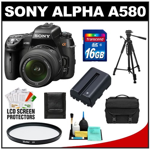 Blackfriday Sony Alpha DSLR-A580 16.2 MP Digital SLR Camera & 18-55mm Lens with 16GB Card + Battery + Case + UV Filter + Tripod + Cleaning & Accessory KitKit includes: Equipped with Quick AF Live View, the Sony Alpha α580 DSLR captures the fast action shots that other cameras miss. Take in the landscape with 3D Sweep Panorama and see into the dark with Handheld Twilight and Multi-Frame NR modes. Preserve your memories with amazing Full HD 1080i movies. The Sony DT 18-55mm zoom lens is excellent for snapshots, portraits, interiors and more. Features a smooth and silent AF operation with built-in Smooth Autofocus Motor (SAM) to handle the full range of your most common shots. In 35mm equivalent, it covers wide-angle 27mm to 82.5mm midrange. Take more high-resolution pictures faster with this 16GB Class 6 High-Capacity SecureDigital (SDHC) memory card. Increase your shooting capacity with this powerful NP-FM500H battery. The Vivitar UV glass filter will filter out unwanted UV light and prevent inaccurate color and less sharp image quality. This multi-compartment case will easily hold your camera, lenses, flash, and accessories. Avoid camera shake and achieve maximum image quality by setting your camera on this sturdy, lightweight 57-inch tripod. This 6-piece cleaning kit contains a Hurricane Air Blower, Lens Cleaning Tissues, Lens Cloth, Lens Cleaning Liquid, Brush and Cotton Swabs.