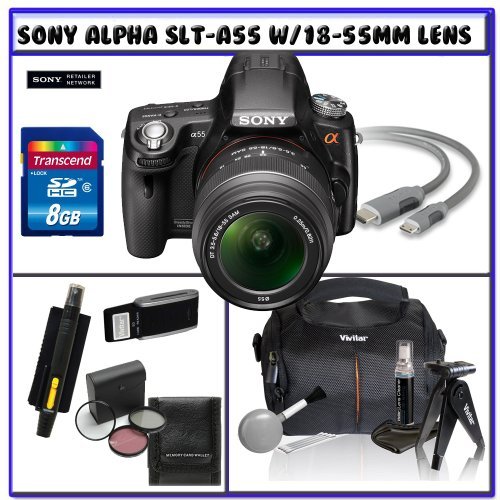 Blackfriday Sony Alpha DSLR-SLT-A55 16.2MP Digital Camera with Sony SAL1855 18-55mm f/3.5-5.6 DT AF Zoom Lens + 14Pc Starter Pack # 2What's in the Box1. Sony Alpha DSLR-SLT-A55 Digital Camera Body, 2. SAL1855 18-55mm f/3.5-5.6 DT AF Zoom Lens, 3. Rechargable Battery (NP-FW50), 4. Shoulder Strap , 5. Body Cap, 6-8 USB Cable, Software CD, 1-Year Parts and Labor Warranty What's in the 14pc Starter Kit Sony Alpha DSLR-SLT-A55 Digital Camera W/18-55mm Lens will take you to the leading edge of DSLR technology, with the first-ever translucent mirror design. For the first time, a high-resolution live image preview with rapid, accurate phase detection autofocus is available at all times--via the LCD or the electronic viewfinder. This means that even moving objects stay in sharp focus at all times, whether you're shooting full HD video or stills. A 3x DT 18-55mm F3.5-5.6 (35mm equivalent 27-82.5mm) lens, built-in GPS that records the location and time of every shot you take and lets you view your images on a map (with compatible computer and Internet applications), an incredibly sharp, bright 3" tiltable LCD screen, built-in flash, full HD 1080/60i video, a fabulous 3D panorama mode that combines 3 pictures into a 3D image, and up to 10 frames per second continuous shooting. | |