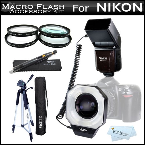 Blackfriday Vivitar Macro Ring Flash For Nikon D5000 D5100 D3000 D3100 DSLR (18-55mm lens) Vivitar DF-586 Dedicated Macro Ring Flash + 52MM Macro Close Up Lens Kit Includes +1 +2 +4 +10 Filters + 57" Pro Tripod + Lens Pen Cleaner + MicroFiber Cleaning ClothProduct Description Kit Includes: The Vivitar DF-586 Dedicated Macro Ring Flash for Nikon delivers the "shadowless" direct light ideal for macro photography, and it's dedicated to Nikon DSLR cameras. It comes with rings to attach to lenses with 52, 55, 58, 62, and 67mm fronts, it has a (100 ISO) guide number of 18m, full I-TTL dedication for Nikon DSLRs, and an exposure confirmation auto check lamp. It delivers app. 150-200 flashes on a battery charge and recycles in 2-3 seconds. The angle of illumination covers lenses 50mm and longer (35mm equivalent) and it's powered by easily found AA alkaline, MiCAd, or Ni-MH batteries. Batteries are not included.