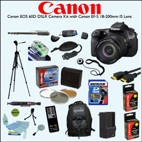 Blackfriday Canon EOS 60D DSLR Camera Kit with Canon EF-S 18-200mm IS Lens With Deluxe Accessory Kit with 8GB SDHC Memory Card, Opteka High Capacity LP-E6 Extended Battery, 72mm Filter Kit and Much More!