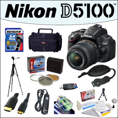 Blackfriday Nikon D5100 16.2MP CMOS Digital SLR Camera with 18-55mm f/3.5-5.6G AF-S DX VR With Opteka 74" Professional Tripod, DSLR Camera Gadget Bag, 8GB SDHC High Speed Memory Card and MUCH MORE!