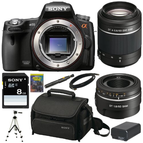 Blackfriday Sony Alpha A55 DSLR A55 SLT-A55V 16.2MP DSLR with Translucent Mirror Technology and 3D Sweep Panorama with Sony SAL552002 Telephoto Zoom Lens and SAL50F18 50mm Lens + Sony Gadget Bag + Sony 8GB SD Card + Replacememtn NPFW50 Battery + Accessory Kit