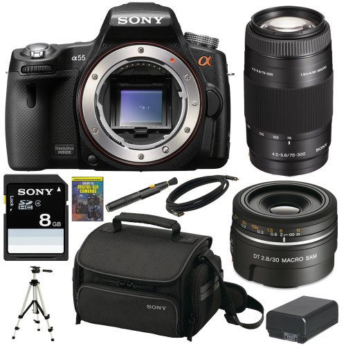 Blackfriday Sony Alpha A55 DSLR A55 SLT-A55V 16.2MP DSLR with Translucent Mirror Technology and 3D Sweep Panorama with Sony 75-300 Zoom Lens and SAL30M28 30mm Lens + Accessory Kit