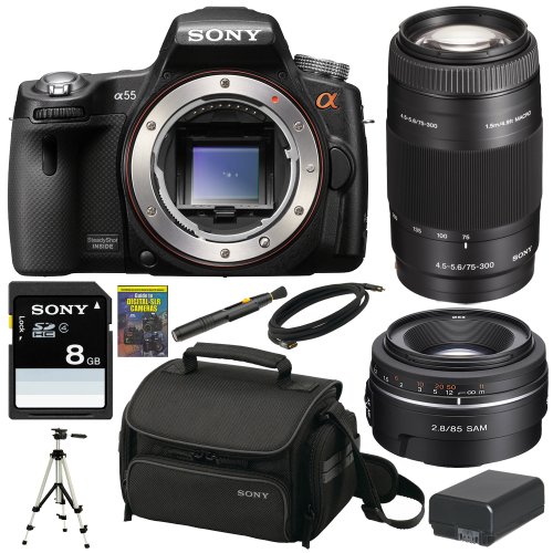 Blackfriday Sony Alpha A55 DSLR A55 SLT-A55V 16.2MP DSLR with Translucent Mirror Technology and 3D Sweep Panorama with Sony 75-300 Zoom Lens and SAL85F28 Telephoto Lens + Accessory Kit