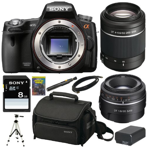 Blackfriday Sony Alpha A55 DSLR A55 SLT-A55V 16.2MP DSLR with Translucent Mirror Technology and 3D Sweep Panorama (Body Only) with Sony SAL552002 Telephoto Zoom Lens and SAL35F18 Wide Angle Lens + Sony Gadget Bag + Sony 8GB SD Card + Replacememtn NPFW50 Battery + Accessory Kit