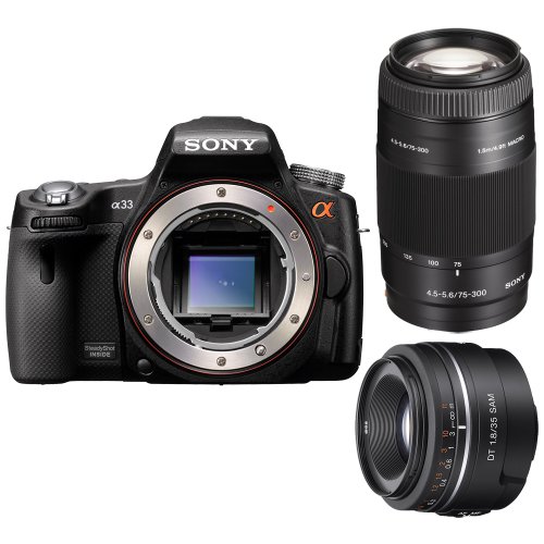 Blackfriday Sony Alpha SLT-A33 DSLR with Translucent Mirror Technology and 3D Sweep Panorama (Body Only) with Sony 75-300 Zoom Lens and SAL35F18 Wide Angle Lens