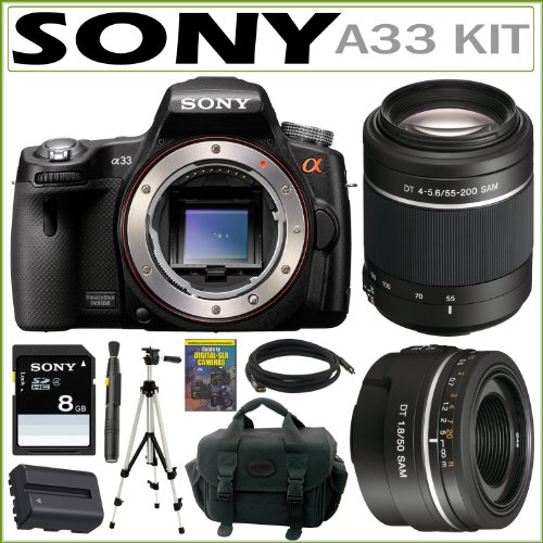 Blackfriday Sony Alpha SLT-A33 DSLR with Translucent Mirror Technology and 3D Sweep Panorama (Body Only) with Sony SAL552002 Telephoto Zoom Lens and SAL50F18 50mm Lens + 8GB Accessory Kit